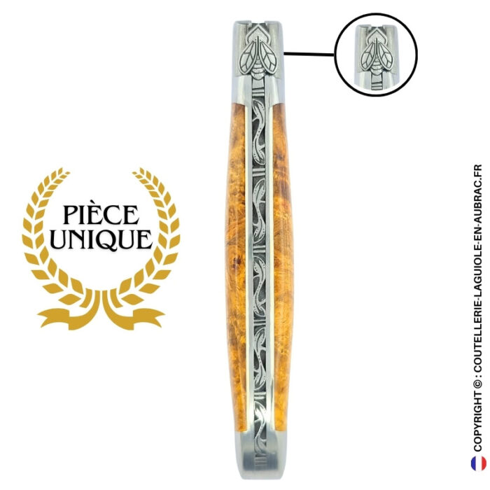 Tout en haut, l’abeille n’a plus tout à fait l’allure rustique des Laguiole de ferme. Ciselée avec une précision presque irréelle, elle adopte des lignes fines, légèrement pointues, comme si le coutelier avait travaillé sous l’influence d’un songe elfique. Les signes gravés dans la matière rappellent ces motifs élégants et aériens que l’on imagine sur des heaumes, des bijoux ou des armes elfiques. C’est une abeille qui ne crie pas sa présence, mais qui impose une silhouette singulière, immédiatement évocatrice pour qui connaît certaines terres du genre fantastique.