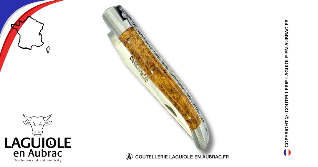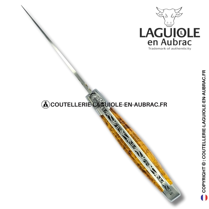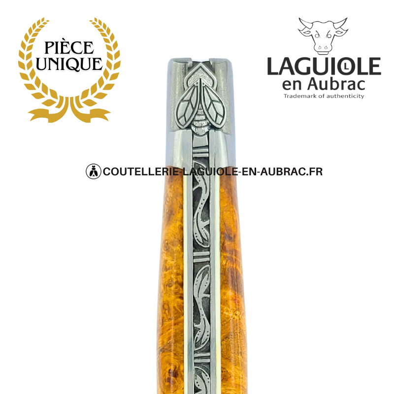 Le ressort déroule, sur toute sa longueur, cinq formes végétales identiques, parfaitement répétées. On dirait cinq feuilles stylisées, cinq pousses issues du même arbre, qui se succèdent à intervalles réguliers. Ce motif, à la fois simple et très travaillé, donne au dos du couteau un rythme discret, comme une incantation répétée. Les intercalaires blancs, entre l’amboine dorée et les platines, tracent un liseré clair, presque lumineux, qui renforce l’impression de pureté de la pièce.