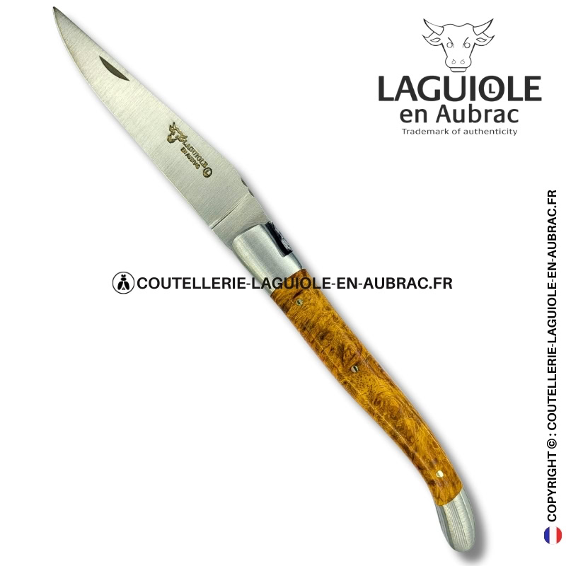 On croirait qu’il a glissé d’une table de Fondcombe pour se retrouver dans une main humaine. Le manche en loupe d’amboine dorée diffuse une lumière douce, presque irréelle, où se mêlent des nuances de miel, d’or et de brun clair. C’est un bois qui semble garder la mémoire d’une lumière ancienne, ni brute ni éclatante, mais posée comme un halo.
