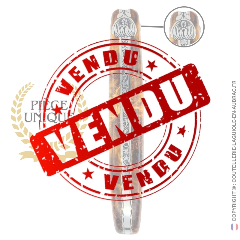 L’abeille, ciselée avec minutie, se distingue par une fleur centrale à cinq pétales qui en compose le cœur. De là s’élèvent deux grandes ailes souples, sculptées en arabesques délicates, évoquant à la fois les courbes d’une plante et l’envol d’un insecte sacré. Le ressort est finement gravé de motifs végétaux sur toute sa longueur, tandis que les deux platines arborent à leur base un ciselage discret mais raffiné. L’ensemble forme un couteau d’un équilibre rare, où chaque détail contribue à une harmonie à la fois naturelle et symbolique.