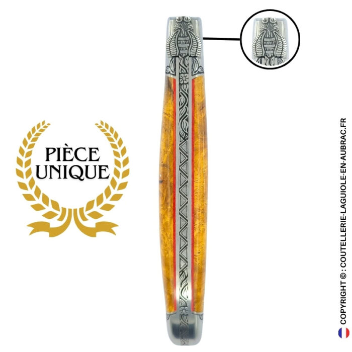Entre le métal et la loupe d’amboine dorée, les intercalaires rouges tracent un fil de braise. Ce liseré coloré souligne la chaleur du bois, comme si le lierre enlacé autour de la pierre laissait entrevoir, par endroits, la braise d’un feu ancien. Étreinte du Lierre est un couteau qui semble à la fois tenir et être tenu, entourer et être entouré : une pièce où l’abeille, le bois, le lierre et la lumière dorée se répondent dans un même mouvement.