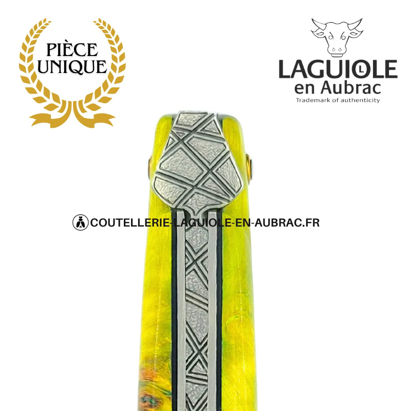 Les intercalaires noirs encadrent le vert éclatant du peuplier comme l’encre encadre le blanc du papier. Ils renforcent la dimension graphique de la pièce, soulignant la jonction entre le bois et le métal. Glyphes d’Émeraude n’est pas seulement un Laguiole : c’est un signe à part entière, une ligne de calligraphie posée dans la paume, prête à écrire d’autres histoires à table ou au fond de la poche.