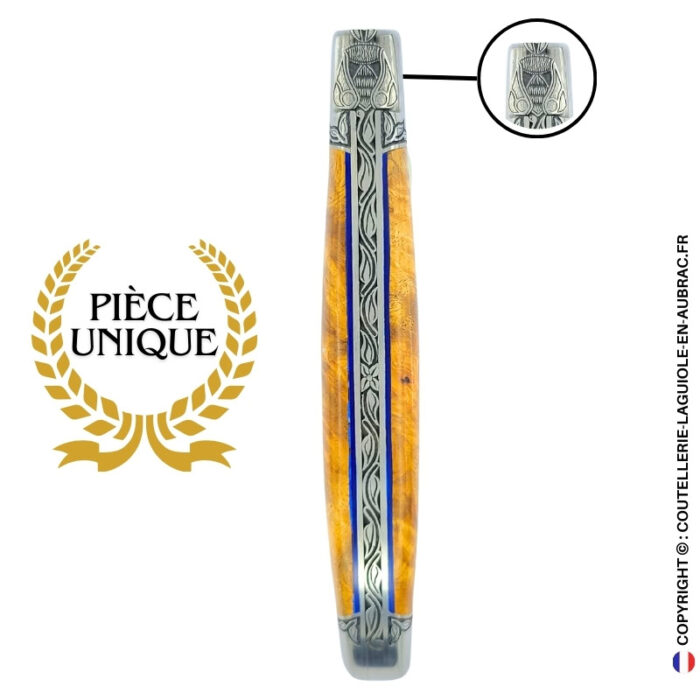 Le ressort prolonge cette impression de raffinement maîtrisé. Ciselé de motifs végétaux, il semble faire courir une branche stylisée le long du dos du couteau, ponctuée d’un point en son centre comme un fruit ou un bourgeon. Ces motifs se retrouvent sur les deux mitres, reprenant le dessin et créant une harmonie rare entre toutes les parties métalliques. Entre le métal et le bois, les plaquettes d’un bleu profond tracent un fin liseré qui fait vibrer encore davantage la loupe d’amboine dorée, comme un ciel d’azur derrière une façade en pierre blonde.