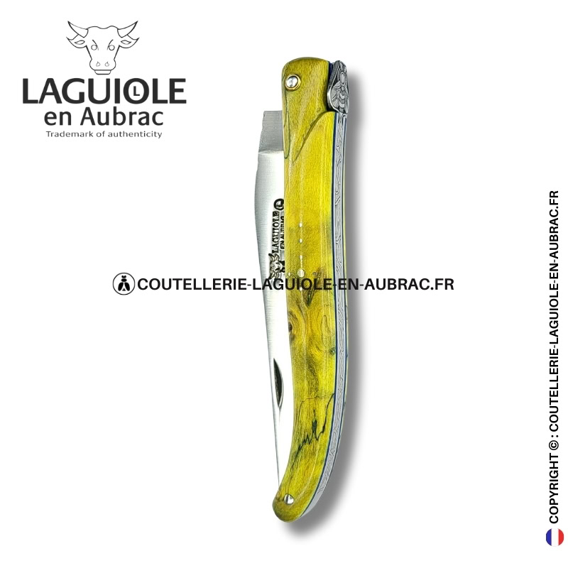 On croirait qu’il vient d’être déposé sur l’autel d’un temple oublié, quelque part entre jungle et ciel. Son manche en loupe de peuplier vert, presque fluorescent, semble capturer une lumière intérieure : un vert éclatant traversé de fines veines qui évoquent des racines, des nervures de feuilles ou les lignes d’énergie d’un vieux monde.