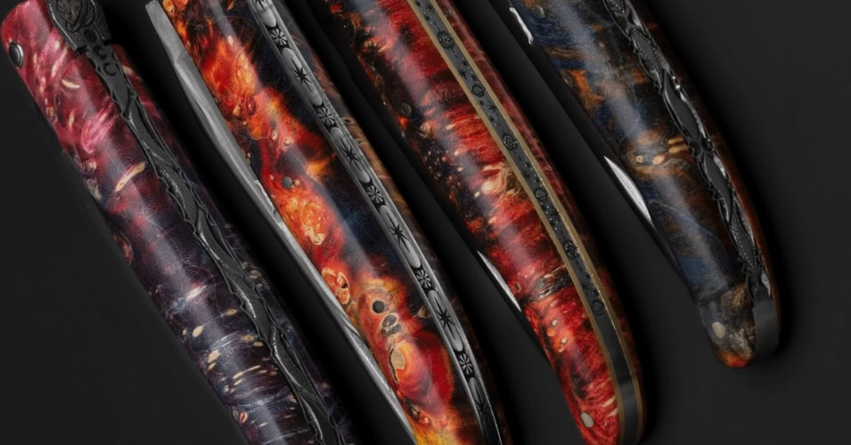 La marqueterie n’est pas une décoration ajoutée : c’est un dessin de matière qui oriente la lumière et affirme une présence sobre. Dans les Collections Signatures, chaque motif raconte : papillon stylisé, géométrie cosmique, graphismes nocturnes… Le style ne crie jamais ; il suggère. Vous choisissez ce qui vous ressemble : une pièce à porter chaque jour, un symbole discret au bureau, ou un couteau de collection qui marque une étape de vie.